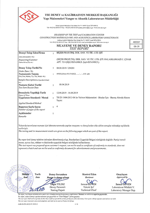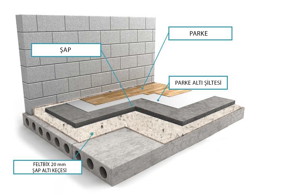 Ses bağlantısını kesmek için atılacak şap kalınlığının yüksekliğinde, duvarlar FeltbiX keçe ile dönülür veya şerit şeklinde kesilmiş FeltbiX keçe duvar birleşim noktalarına yapıştırılır.