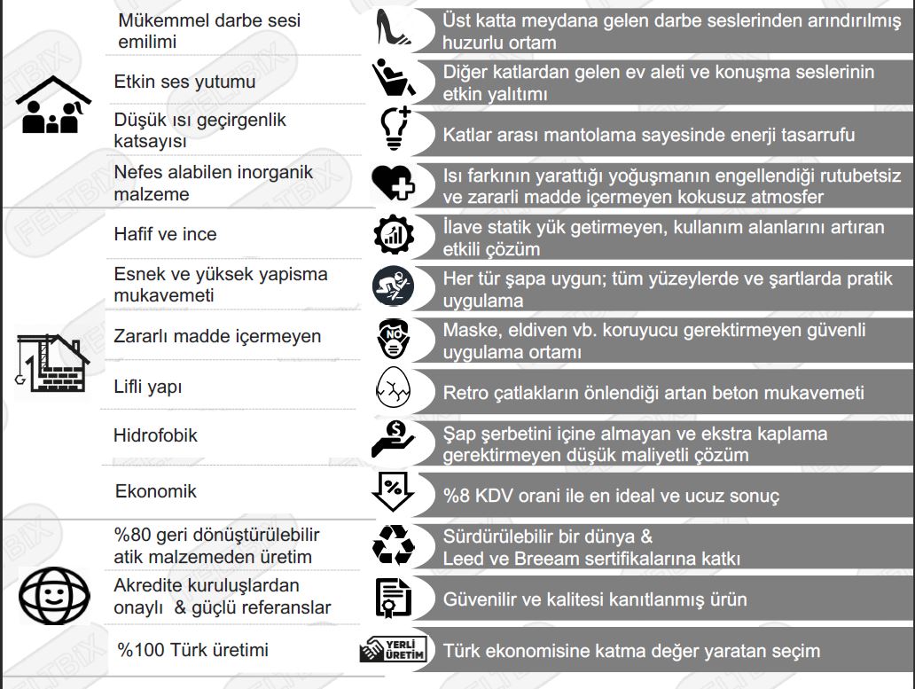 Sap kalınlığı, kot farkı ve beklenilen ses ve ısı yalıtımı performansına göre FeltbiX kalınlığı (15-20-30 mm) belirlenir.